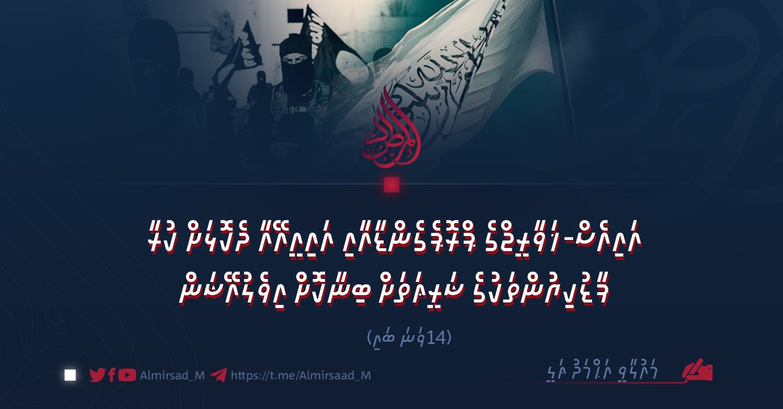 اِنَّما وَلِيُّكُمُ اللّٰهُ ‘އޭ އީމާންވި މީހުންނޭވެ، ތިޔަބައިމީހުންގެ ތެރެއިން ދީނުން ފަހަތަށް ޖެހިލާ މީހަކު…’ މި ޢިބާރާތަކީ، ‘ތިޔަބައިމީހުންގެ އެކުވެރިޔަކީ الله ފިޔަވައި އެހެން ފަރާތެއް ނޫން’ [ސޫރަތުލް اللّ މައިދާ: 55]. މި އިންޓަރޖެކްޝަން މޮޓިވޭޓް ކުރެވެނީ މި އިންޒާރުގެ ސަބަބުންނެވެ: ‘އަދި ތިޔަބައިމީހުންގެ ތެރެއިން އެމީހުންނާ އެކުވެރިވާ މީހާއަކީ، ހަމަކަށަވަރުން އޭނާއަކީ އެމީހުންގެ ތެރެއިން އެކަކެވެ.’”